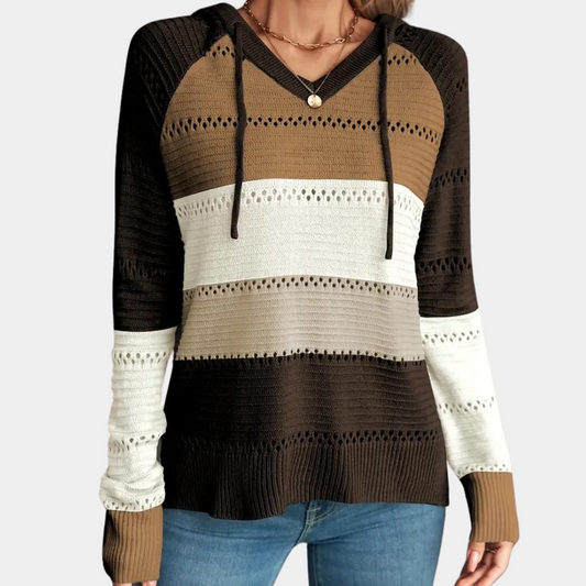 Wielokolorowy sweter z kapturem i głębokim dekoltem w kształcie litery V zapewnia stylowy wygląd.