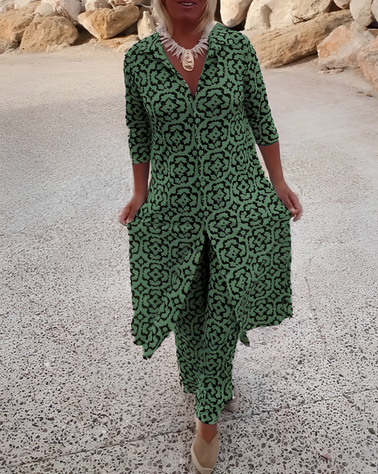 Długa sukienka z etnicznym nadrukiem i kieszeniami
