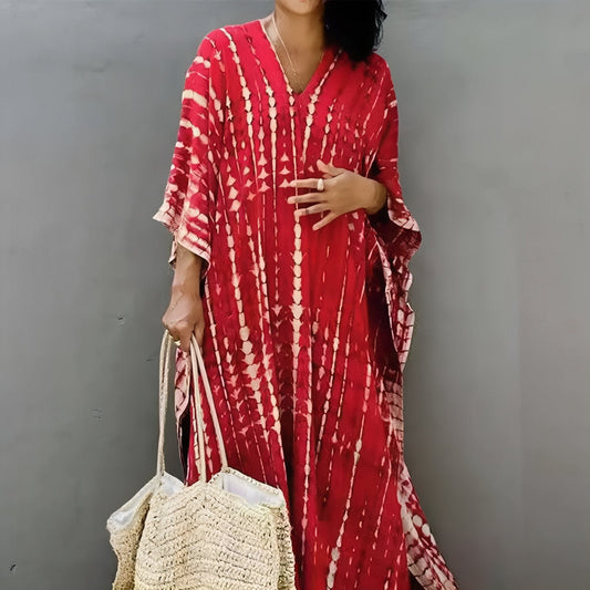 Długa sukienka z nadrukiem i szerokimi rękawami nietoperzowymi