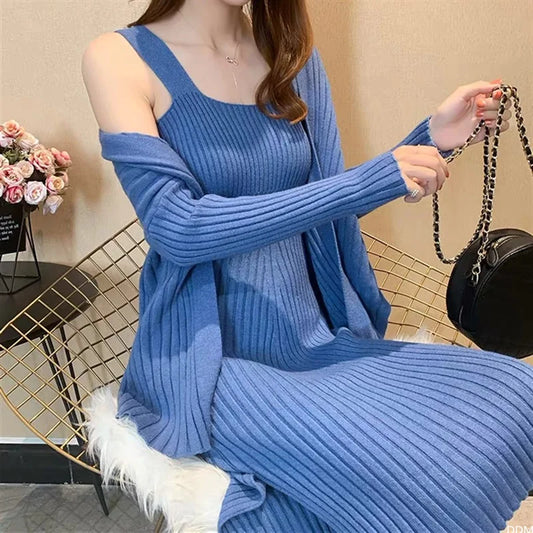 Lethran - Dzianinowy kardigan, sweter, sukienka, dwuczęściowy komplet
