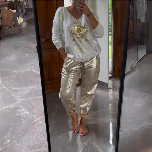 Octavia - Damskie spodnie z lnu i bawełny z elastycznym paskiem w talii
