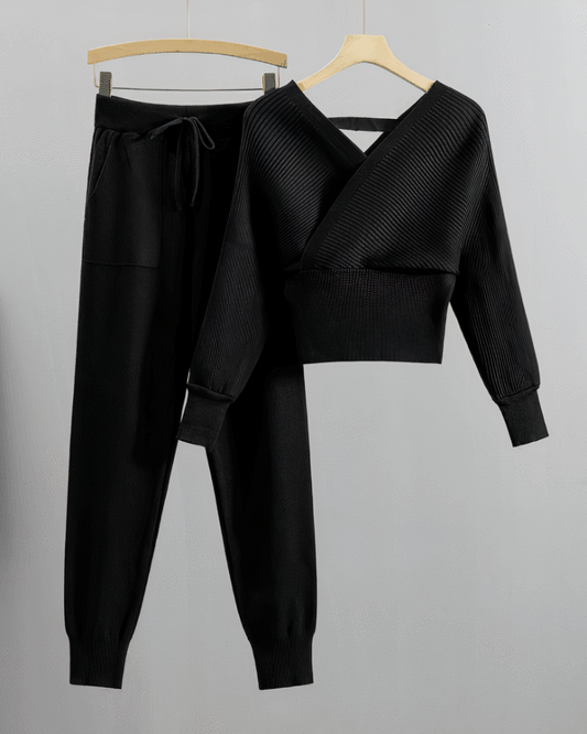 Seksowny dzianinowy top z odkrytymi ramionami i spodnie - Willow
