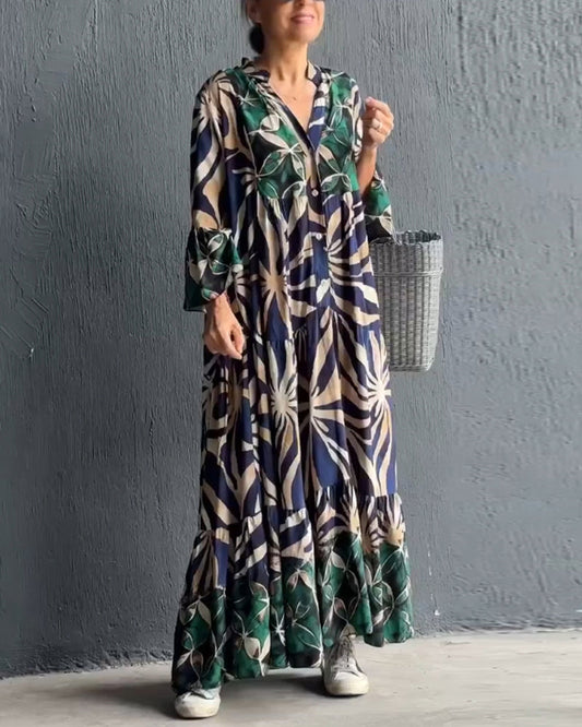 Elegancka długa sukienka z dekoltem w serek w panterkę