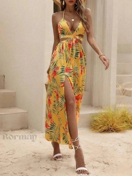 Eileen - Drukowana sukienka z odkrytymi plecami, kokardą i rozcięciem przy dekolcie