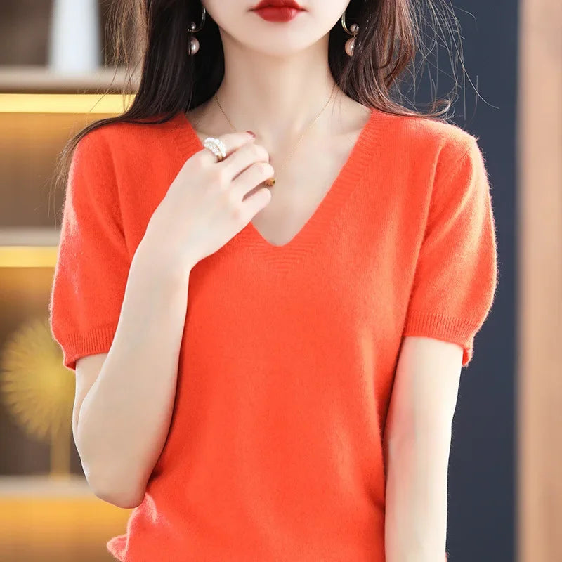 Claire - Dzianinowy sweter z krótkim rękawem i dekoltem w szpic
