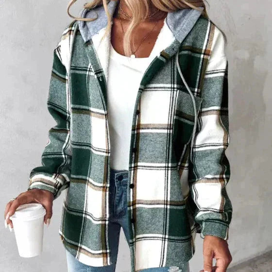 Trudy - Damska zielona kurtka w kratkę z kapturem